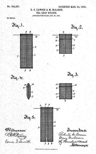 Around the turn of the twentieth century, patents began appearing in the US for mesh bags to hold tea leaves. One notable example is the patent filed in 1901 for a fabric mesh Tea Leaf Holder by Roberta Lawson and Mary McLaren of Milwaukee, Wisconsin. Thomas Sullivan, often credited with the invention of the tea bag, didn’t send out tea in silk sample pouches to his customers until 1904. As more designs entered the market, Americans found the ease of steeping in bags and the economical advantages of using less tea per steep were preferable to loose leaf. Tea bags began overtaking the loose leaf market.