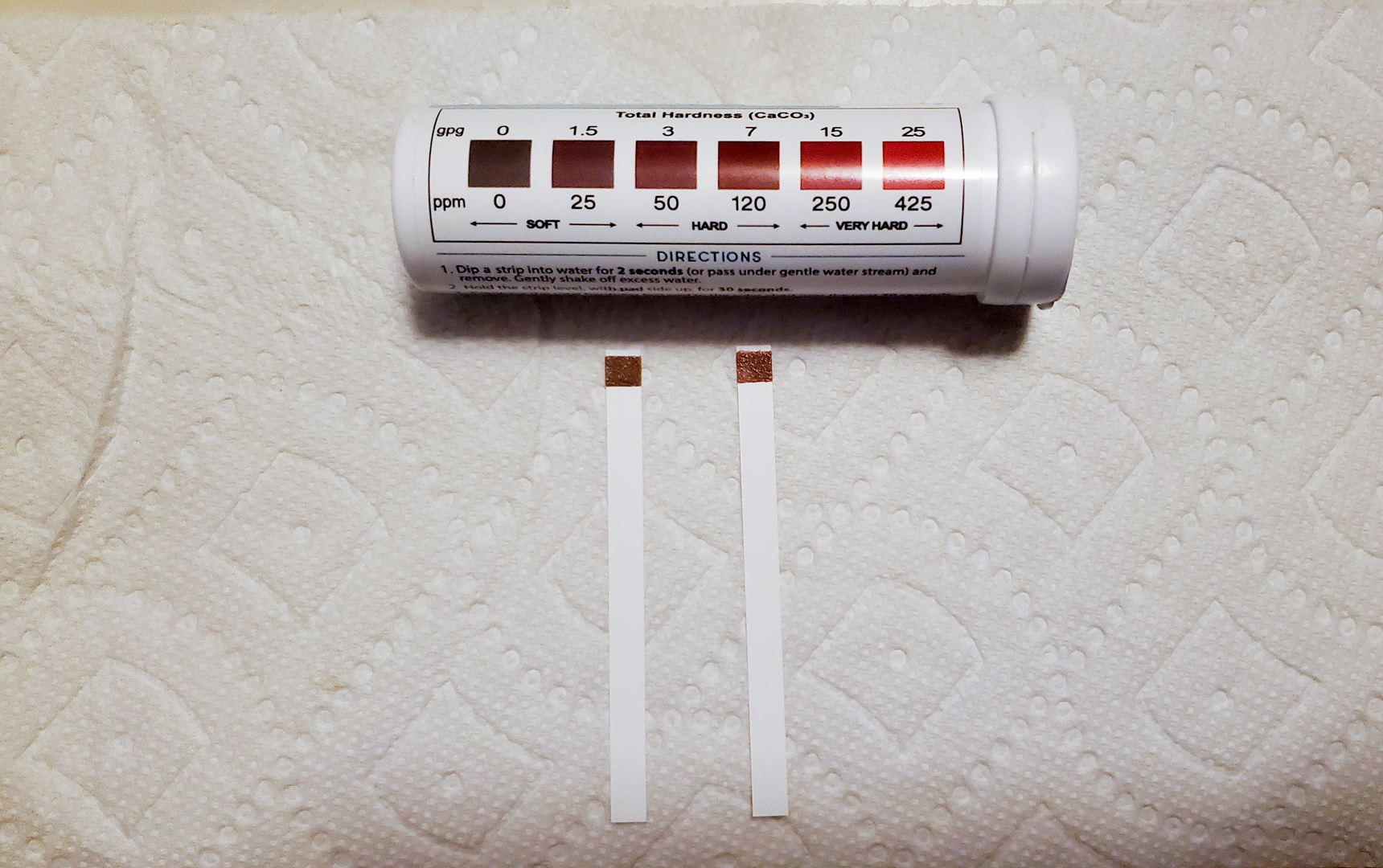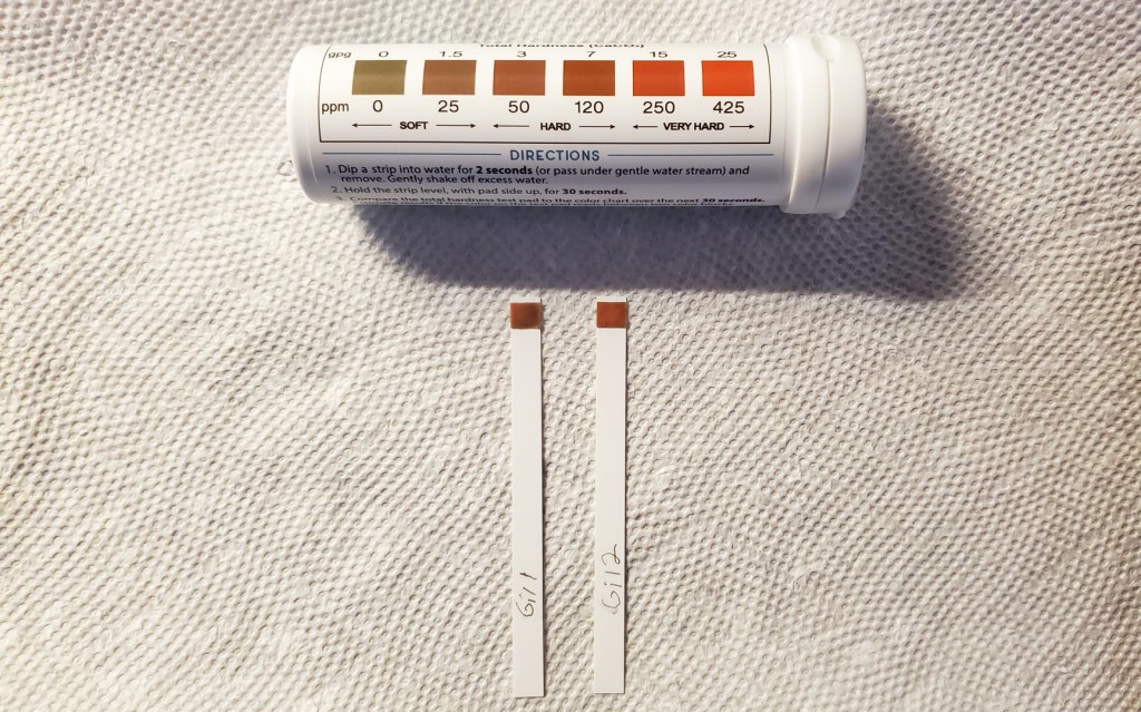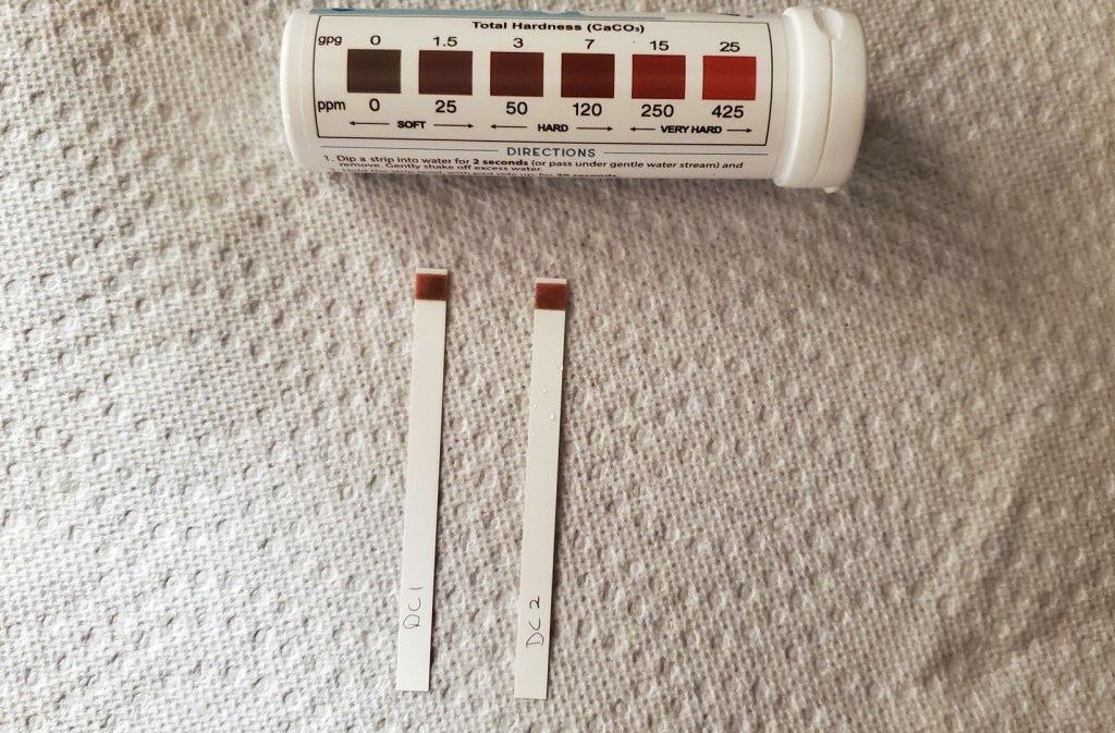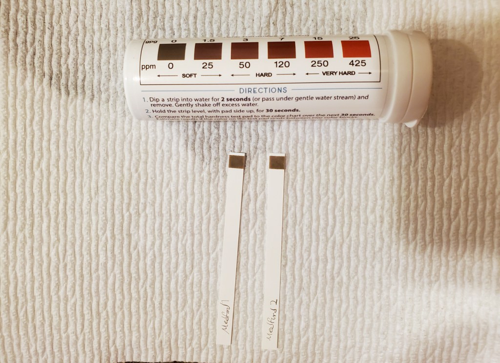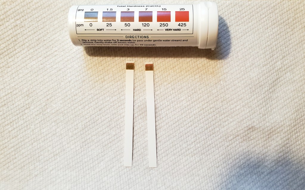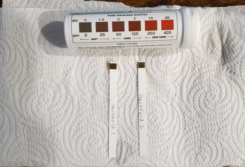 The two nights we spent in a small Hartford apartment were in the company of a good friend, seeing a show on the Hartford Stage, and exploring the surrounding nature reserves. Packing up to leave was bittersweet. Emotions shifted, though, when I saw those two brown squares on the water testing strips. Zero. The lowest I’d ever seen it. Packing was set aside for a moment as I searched for a water softener in the home. I never found one, but have to assume one was there. There was no way the water coming out of the tap would be naturally zero.