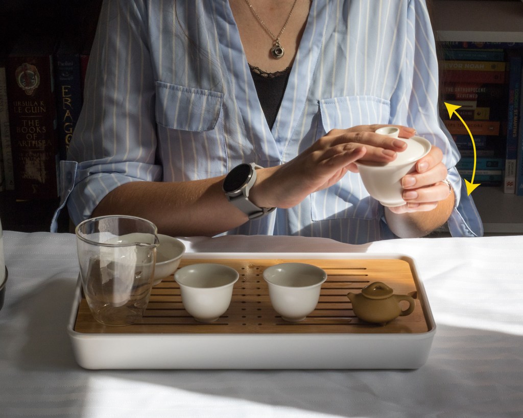 Holding the lid secure on your gaiwan, give the leaves a shake. The leftover moisture and warmth from when you heated the gaiwan with water will “wake up” the leaves. When you open the lid, give both the leaves and the lid a whiff. You should get a strong aroma to enjoy and maybe a hint of what’s to come.